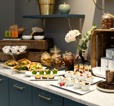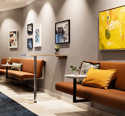 I loungen utanför lokalerna finns en härlig mingelyta för kortare pauser när hjärnan behöver ladda om. Fika och kaffe serveras här och gör att mötet kan fortgå enligt en effektiv plan utan långa omständiga förflyttningar.
