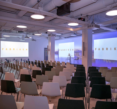 Med en industriell och skandinavisk touch erbjuds flexibla förutsättningar och möjligheter. Konferenser, Middagar, modevisningar, mässor och livespelningar lämpar sig alldeles utmärkt på Fabriken. Med nästan 900 kvadratmeter, fyra meter i takhöjd erbjuder Fabriken lokaler i varierande storlek, allt från styrelserum till auditorium med plats för sällskap på 200 personer.