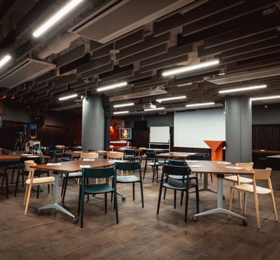 Den största lokalen rymmer upp till 150 personer för mingel/stående, biosittning för upp till 75 personer eller sittning i öar för upp till 48 personer.