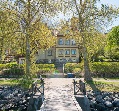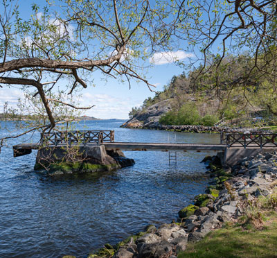 Fågelvägen är möjligtvis något kortare, men som fisken simmar når man Hotel J på en kvart. Båten tar man från Nybrokajen eller Slussen. Med sitt underbara läge finns det inte mycket mer att önska i omgivningar och skönhet.