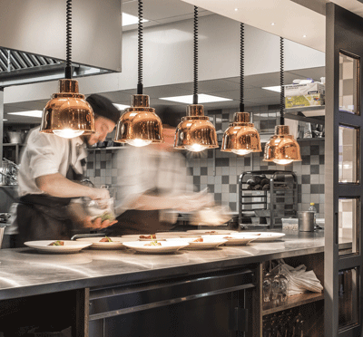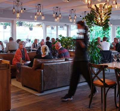 I restaurangen finns det plats för 100 matgäster, maten lagas av deras kockar i ett öppet kök och här kan man se hur de tillagar just din rätt. Här läggs det stor vikt vid att maten ska vara närproducerad, ekologisk och tillagad på bästa sätt med respekt för råvarorna.