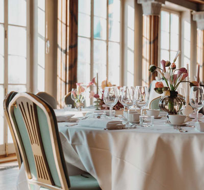 En tillhörande vinkällare bistår med måltidsdrycken när så önskas, och utlovar kittlande toner av de finaste druvor som naturen kan växa.