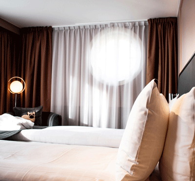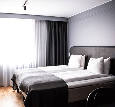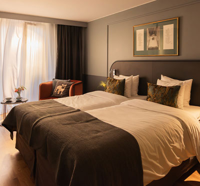 Mjuka, varma färgkombinationer dekorerar 112 sovrum på Hotell Hasselbacken. Här kan 276 mötesdeltagare övernatta när konferensen kräver flera dagars arbete, och övernattar, det gör man gärna. Minst 17 kvadratmeter blir ytan för gästen, som kan vandra över matta trägolv och njuta av ett ombonat badrum i marmor samt skön fåtölj att koppla av i på kvällskvisten.
