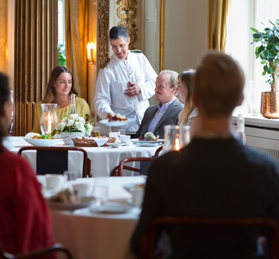 Välkända Restaurang Grodan som finns i samma fastighet svarar för allt det goda som serveras. Mingel och tilltugg, konferensluncher eller festmiddagar. Allt tillagat med samma finess och med råvaror från utvalda leverantörer. I festvåningen kan det dukas för 175 sittande gäster vid runda bord.