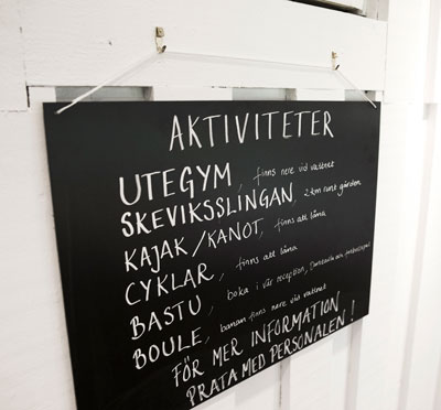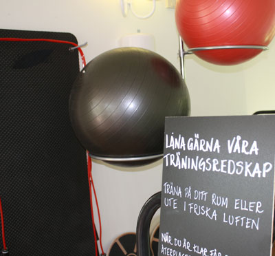 Här finns träningsredskap så som hantlar, yogamattor, balansplattor, träningsband och kettlebells som alla gäster är välkomna att låna för träning ute eller inne!