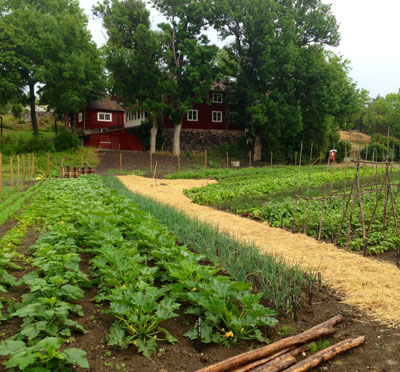 I det stora grönsakslandet om ca 700 kvm så odlas det egna grönsaker, rotfrukter, örter, bär och frukter.