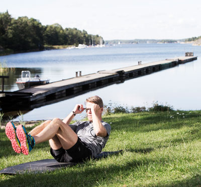 Runt gården öppnar sig natur och terräng som är gjorda för att sätta din kropp i rörelse. Alla skogsstigar, motionsspår, ängar och havsvikar är idealiska för allt från fridfulla promenader till mjölksyreframkallande PT-pass. I denna miljö kan de också erbjuda både gym och träningsredskap både utomhus och inomhus. Efter ditt träningspass kan du koppla av i relaxen, i någon av badtunnorna eller i bastun med svalkande bad i havet.